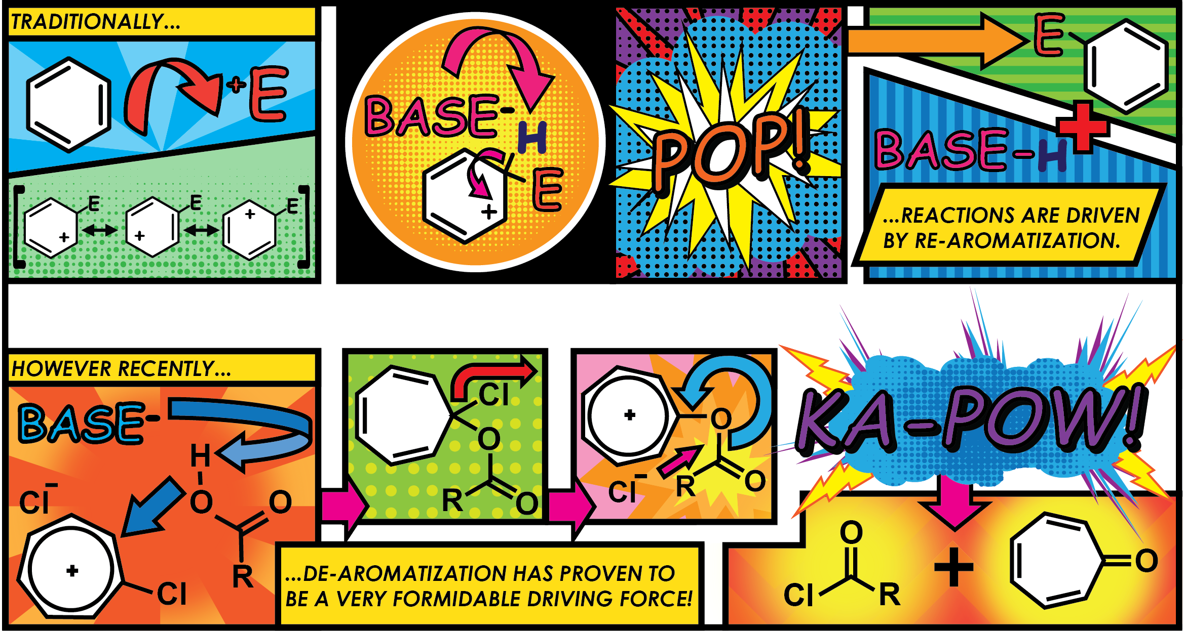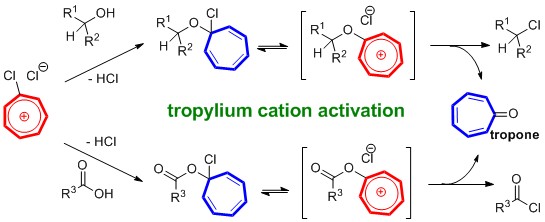 The Nguyen group is one of the first few groups utilizing non-benzenoid aromatic ions to promote organic reactions. A new method for the nucleophilic substitution of alcohols and carboxylic acids and other substrates using aromatic tropylium cation activation has been developed in our group recently. It demonstrates, for the first time, the synthetic potential of tropylium cations in promoting chemical transformations.
